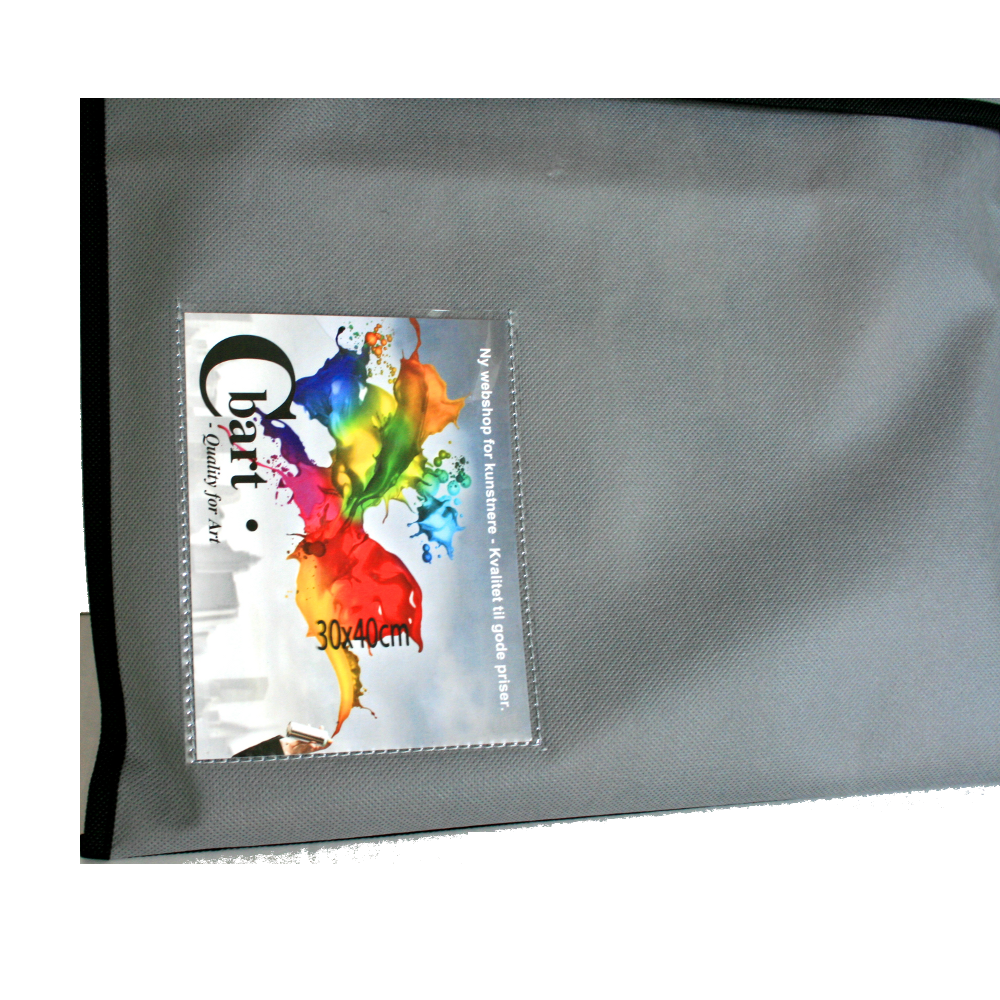 På forsiden er en lomme med en lynlås til opbevaring af fakturaer, visitkort mv. Der er en lille gennemsigtig lomme på forsiden, hvor størrelse på Art Bag'en står, og hvor du kan lægge information, så du hurtigt kan identificere hvilket maleri der er i tasken.