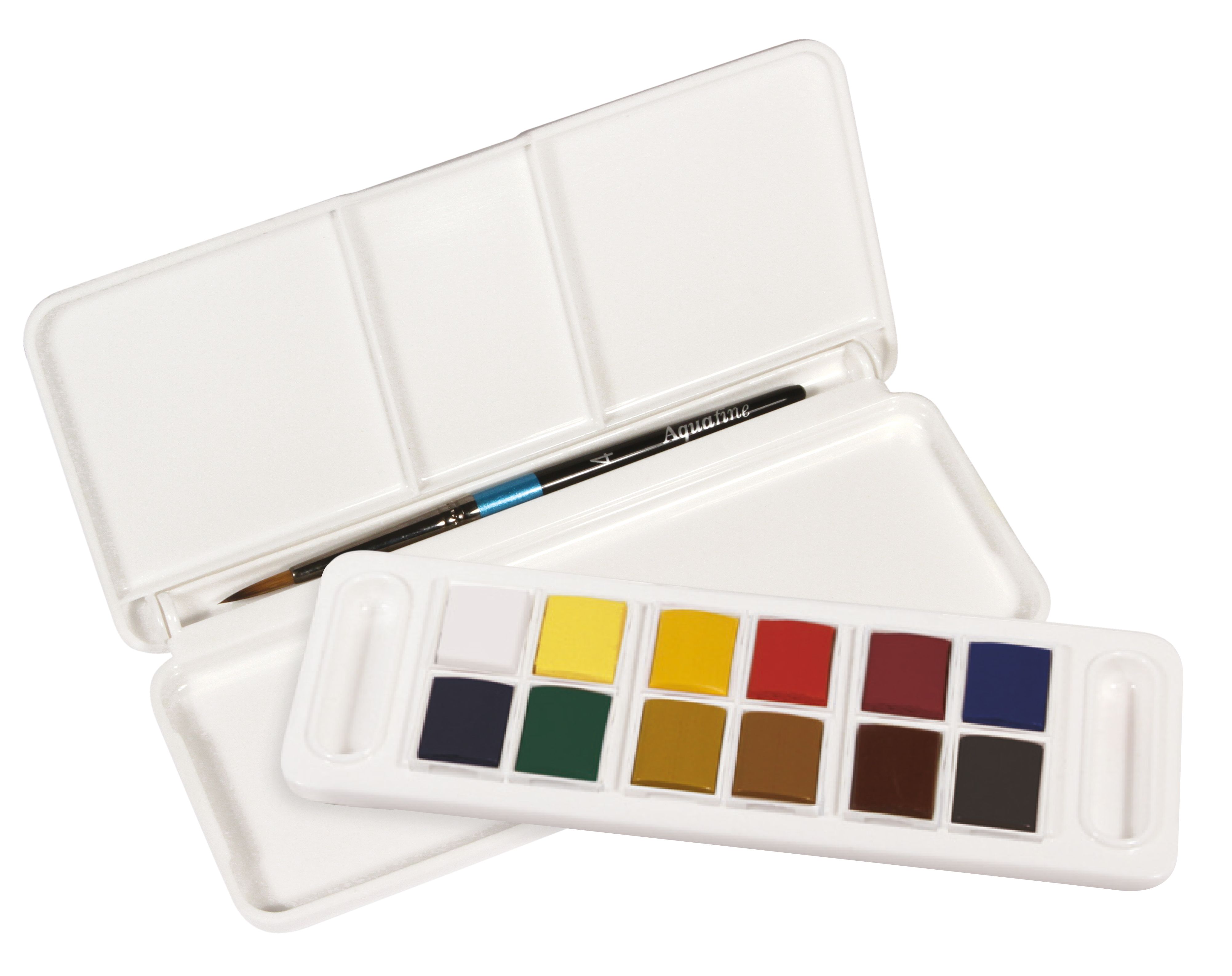 Aquafine akvarelsæt indeholder 12 farver og en pensel i en plastboks ca. 10x14 cm. Særdeles velegnet til at medbringe på rejsen eller bare ud i naturen.