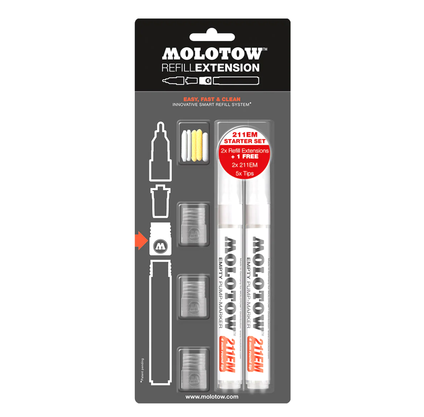 Et sæt med 2 stk. Molotov Pump Marker stk. 4 mm, round. En tom Molotov Pump marker kan fyldes med eks. Golden fluid eller Golden high flow og bruges til at tegne med, at signere sit maleri med og meget andet.