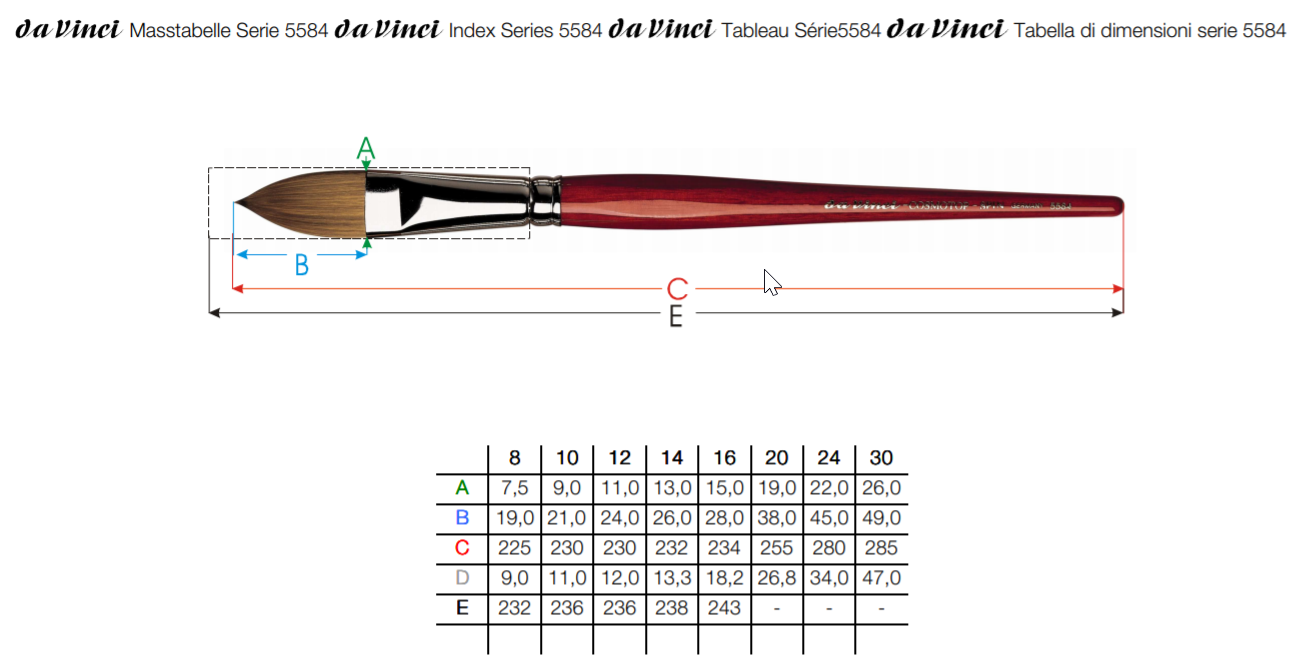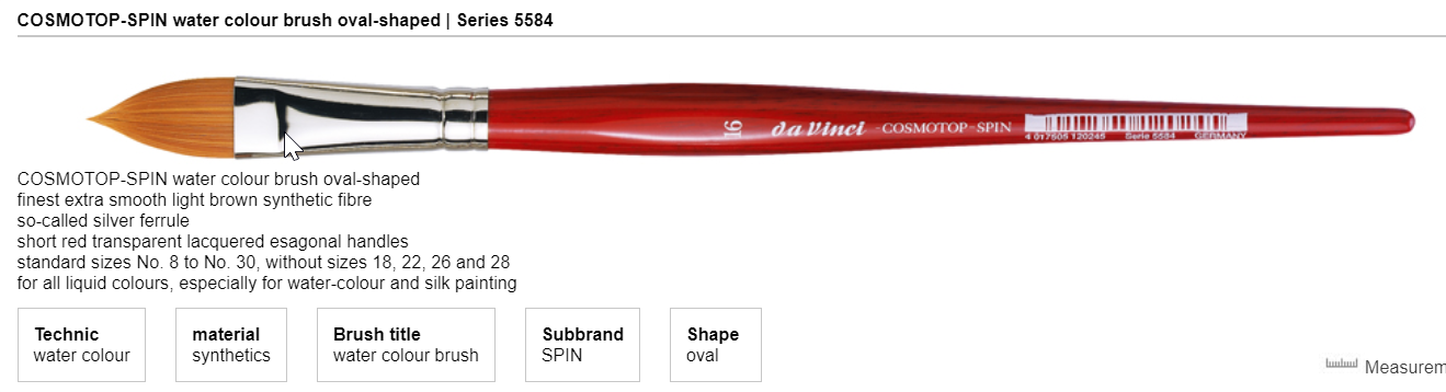 Cosmotop Spin er en akvarelpensel fra da vinci med syntetiske hår. Denne pensel har en oval/filbert form. Det er god holdbar og slidstærk pensel, som er karakteriseret ved at have: