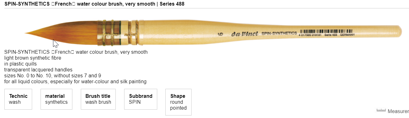 Cosmotop Spin er en akvarelpensel fra da vinci med syntetiske hår. Denne pensel har fransk binding. Det er god holdbar og slidstærk pensel, som er karakteriseret ved at have: