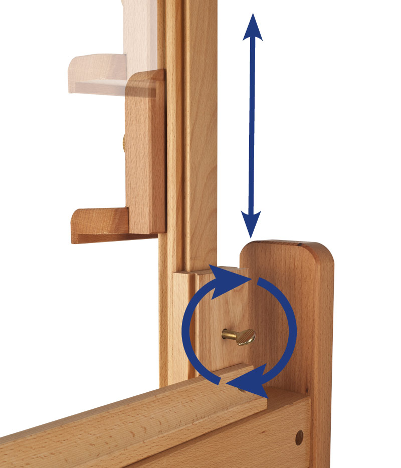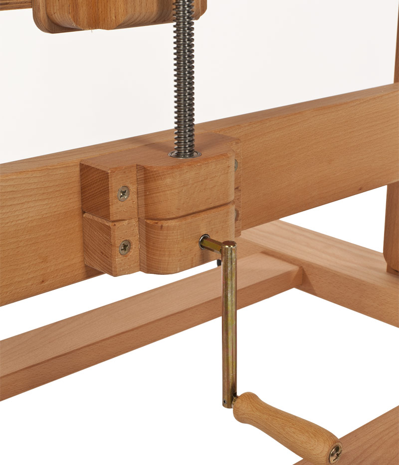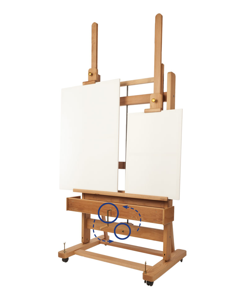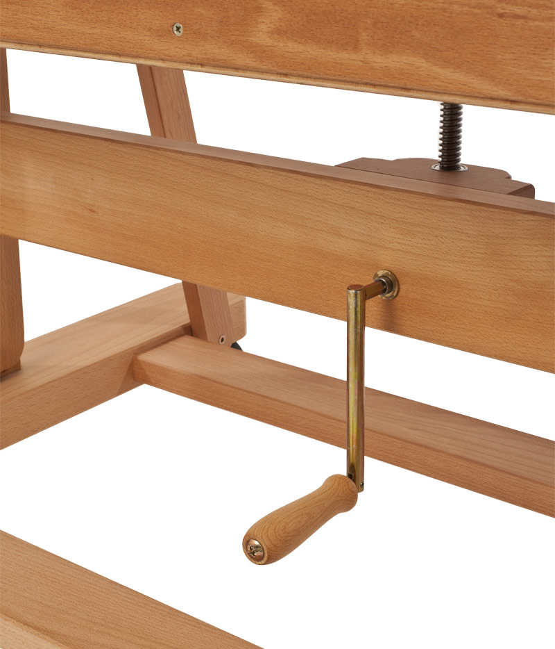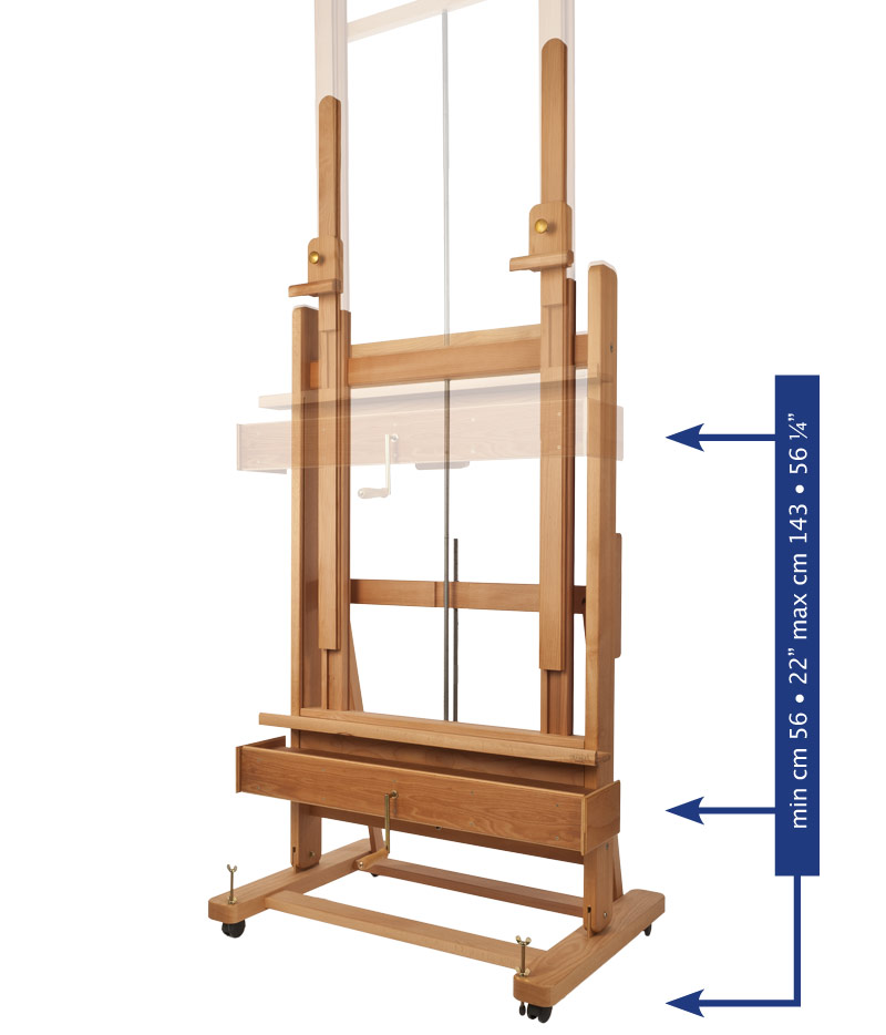 Et professionelt kvalitetstaffeli med dobbelt mast og 2 håndsving. Håndsving til hældning og håndsving til hejs. Staffeliet er i olieret bøgetræ.