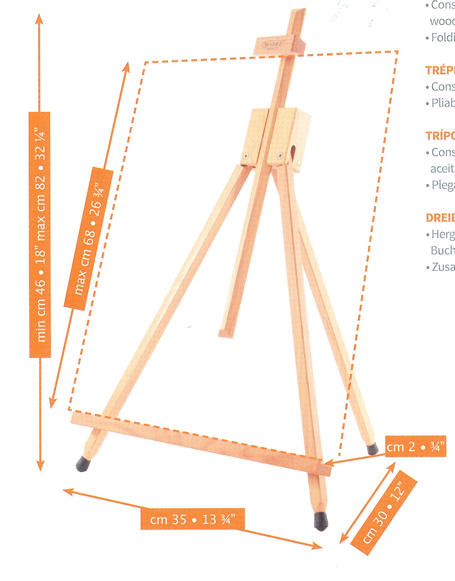 Et enkelt foldbart bordstaffeli. Staffeliet er i olieret bøgetræ, og kan tage lærreder op til 68 cm i højden.
