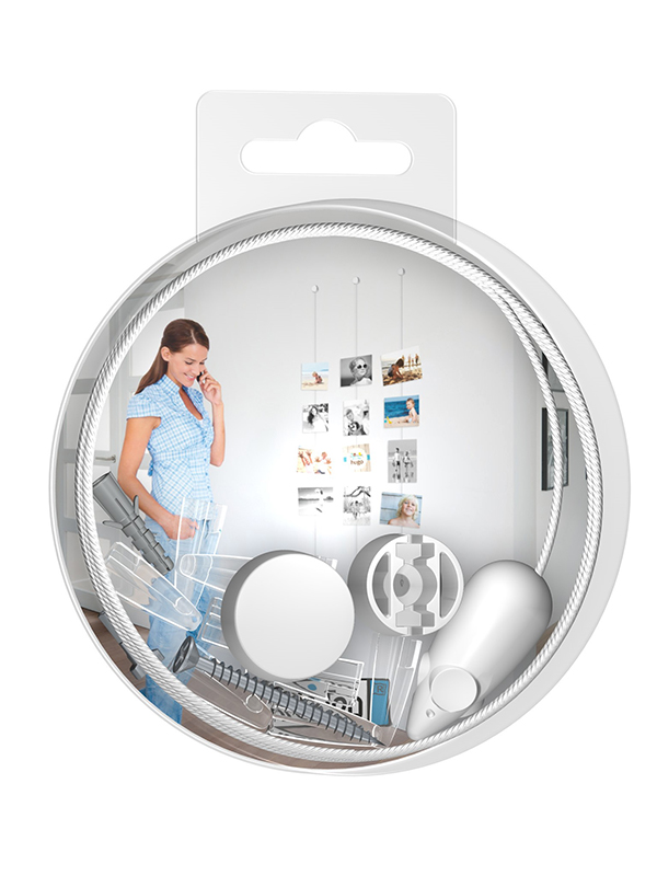 Sættet består af skrue, ravpluks, line med "mus" for enden, 12 stk. nylon-"kroge" til montering af billeder, samt en kapsel der dækker skruehullet.